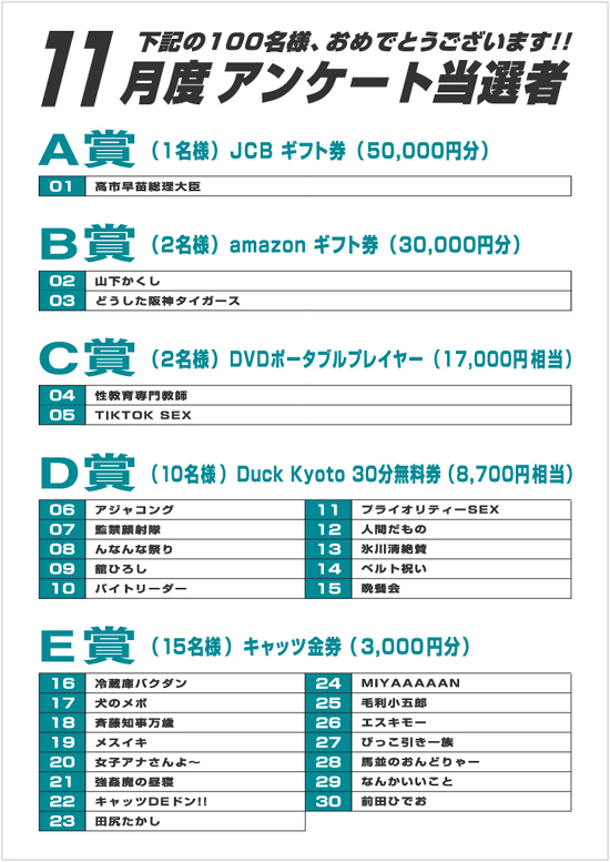 2025年11月5日 キャッツ お知らせ, アンケートの当選者発表 0