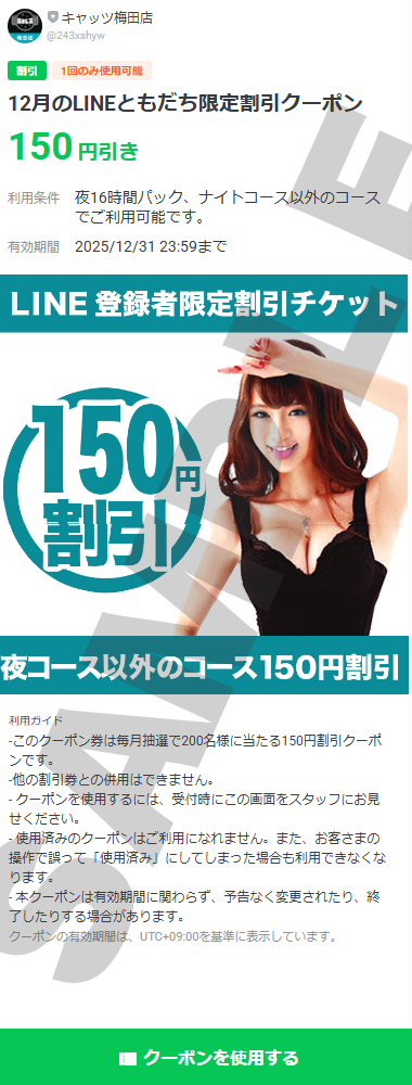 12月に配布したラインクーポンはコチラ! 2025年12月18日 キャッツ お知らせ, LINEともだち募集中 0 12月5日にラインで配布したクーポンは夜16時間パック、ナイトコース以外のコースで使用できる150円割引クーポンでした!12/5の時点でLINEのお友達になっていただいた方に抽選で配布したクーポンです※他の割引チケットとの併用はできません。下記アイコンをクリックして友達登録! 梅田店LINEの友達登録はLINEアイコンをクリック ↓ ↓ ↓ ↓
