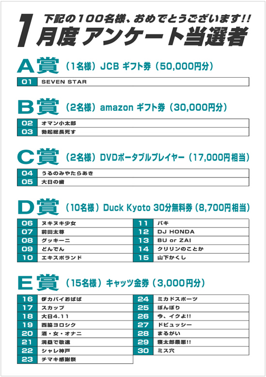 1月のアンケート当選者発表です。