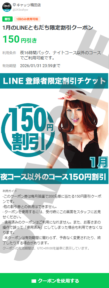 1月に配布したラインクーポンはコチラ! 2026年1月15日 キャッツ お知らせ, LINEともだち募集中 0 1月5日にラインで配布したクーポンは夜16時間パック、ナイトコース以外のコースで使用できる150円割引クーポンでした!12/5の時点でLINEのお友達になっていただいた方に抽選で配布したクーポンです※他の割引チケットとの併用はできません。下記アイコンをクリックして友達登録! 梅田店LINEの友達登録はLINEアイコンをクリック ↓ ↓ ↓ ↓